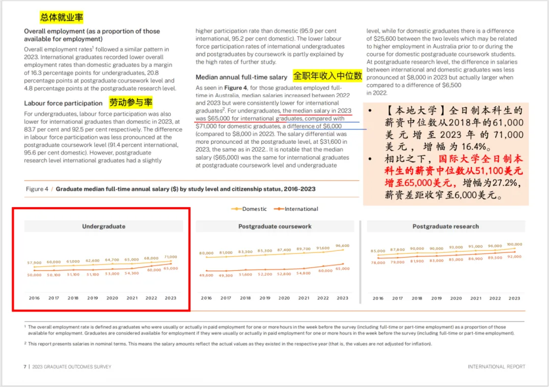 2023 年,澳洲国际本科生全职年薪中位数为 65,000 澳币(约合人民币 30 万元),较 2018 年的 51,100 澳币增长 27.2%;同期本地本科生年薪从 61,000 澳币增至 71,000 澳币,两者差距从 10,000 澳币收窄至 6,000 澳币,国际毕业生薪资竞争力持续提升。