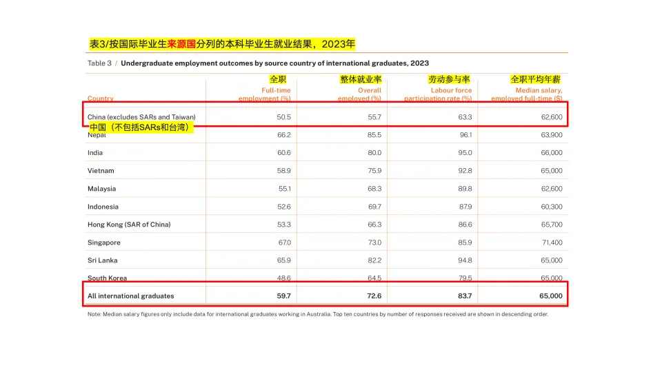 劳动参与率:国际本科生为 83.7%,本地生为 92.5%;授课型研究生中,国际生参与率 91.4%,本地生 95.6%,差距随学历提升逐渐缩小。