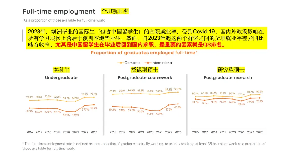 总体就业率:国际本科生(72.6%)比本地生低 16.3 个百分点,授课型研究生差距为 20.8 个百分点,研究型研究生差距最小(4.8 个百分点)。