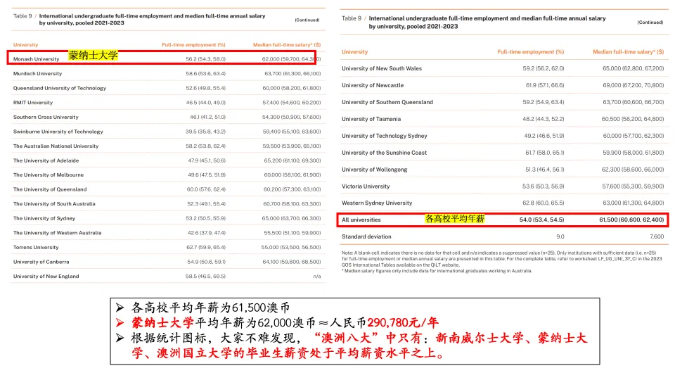 在澳洲八大名校中,新南威尔士大学(65,000 澳币)、蒙纳士大学(62,000 澳币)、澳洲国立大学的国际本科生薪资均高于全澳平均水平,其中蒙纳士大学薪资在 “八大” 中稳居前列。