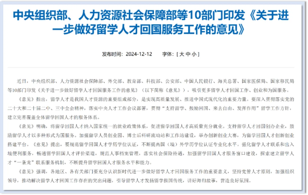 报告援引国家 10 部门《关于进一步做好留学人才回国服务工作的意见》指出,留学人才已纳入国家统一就业体系: