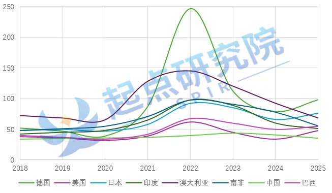 2025年户用储能市场进入欧美市场需求稳健增长、新兴市场需求大规模爆发的多元化格局,市场驱动力也从自2022年能源危机情绪驱动与高价套利,升级为电价+政策+能源结构调整的多元驱动。起点研究院SPIR数据显示,2025年全球户用储能系统出货量达40GWh,预计到2030年,全球户用储能系统出货量将达180GWh。1.全球批发电价与户储规模:2025年全球批发电价进入“分化均衡”阶段,新能源转型与化石能源成本的博弈将长期主导价格走势。随着可再生能源发电量首超煤炭后,其出力不稳定性推动各国批发电价波动差异化。2025年,受化石能源(主要为天然气)成本上涨与需求增长影响,欧美(德、美、日)批发电价同比上涨;而亚非拉地区(印度、澳大利亚、南非)得益电力系统供电情况改善,批发价格同比下降;中国与巴西整体稳定,呈现稳中有波动的特征。图表1:2018-2025年全球主要国家批发电价(USD/MWh)