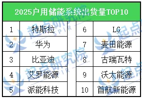 起点研究院SPIR数据显示,2025年全球户用储能电池出货量TOP10分别为瑞浦兰钧、鹏辉能源、亿纬锂能、比亚迪(弗迪电池)、融捷能源、派能科技、新能安、赣锋锂电、国轩高科、欣旺达。数据来源:起点研究院SPIR