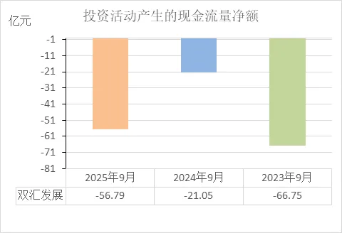 投资现金流每年都是大额净流出(2025年前三季度-57亿)。