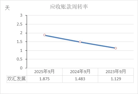 财务非常健康:回款速度这么快,意味着现金流充沛、坏账风险极低,对下游话语权极强。2025年天数略有上升(但仍不到2天),属于正常波动,不影响整体健康的回款状态。