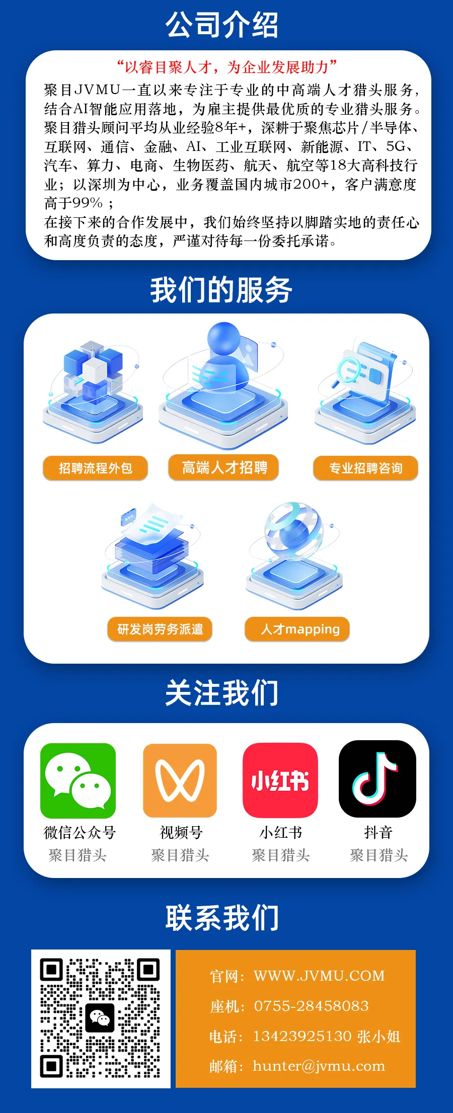 若您的企业正寻求行业的核心人才赋能增长,欢迎与聚目猎头携手,我们将精准匹配优质人才,为您的企业快速稳定发展全力赋能!
