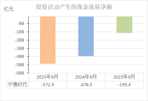 从近三年投资活动现金流看:2023年9月:-199.4亿 → 2024年9月:-478.9亿 → 2025年9月:-572.9亿