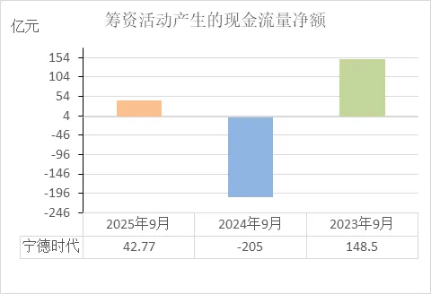 从近三年筹资活动现金流看:2023年9月:+148.5亿 → 2024年9月:-205亿 → 2025年9月:+42.77亿