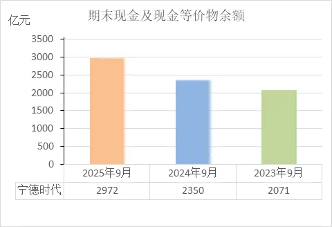从近三年期末现金余额看:2023年9月:2071亿 → 2024年9月:2350亿 → 2025年9月:2972亿