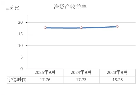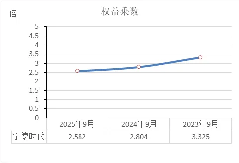宁德时代近三年权益乘数持续下降:2023年9月3.33倍 → 2024年9月2.80倍 → 2025年9月2.58倍