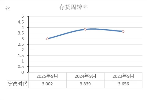 宁德时代近三年存货周转率:2023年9月3.66次 → 2024年9月3.84次 → 2025年9月3.00次