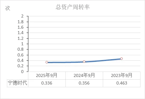 从近三年总资产周转率看:2023年9月:0.463次 → 2024年9月:0.356次 → 2025年9月:0.336次