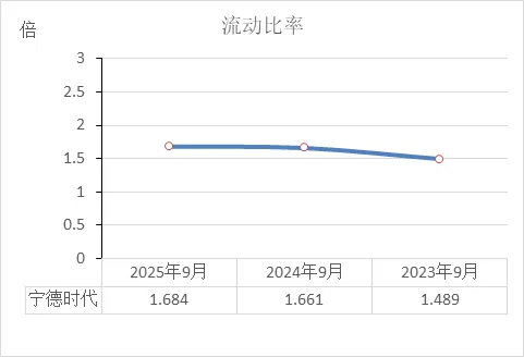 宁德时代近三年速动比率维持在健康水平:2023年9月1.31倍 → 2024年9月1.46倍 → 2025年9月1.45倍。