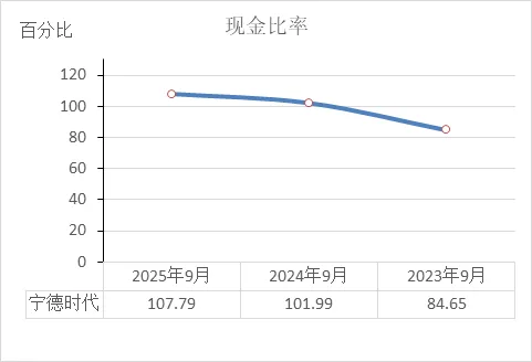 宁德时代近三年现金比率稳步提升:2023年9月84.65% → 2024年9月101.99% → 2025年9月107.79%