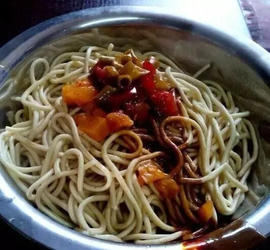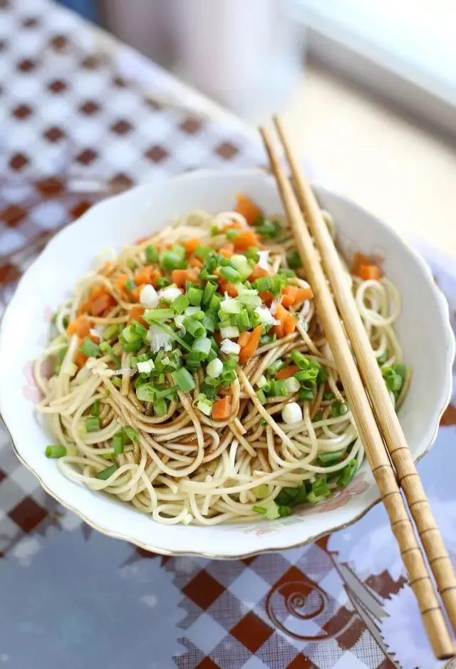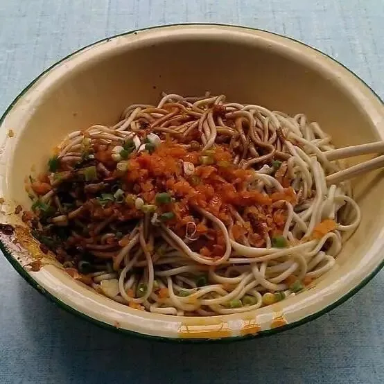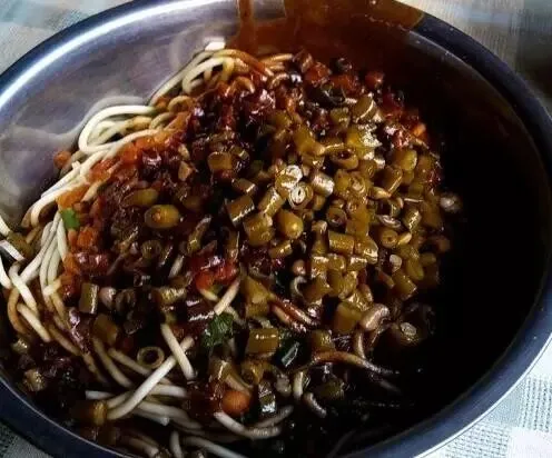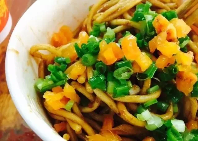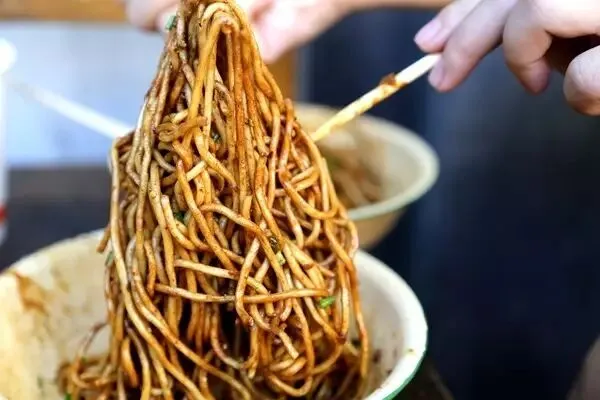 制作方法:碱面事先煮熟,过冷和过油后,再淋上用芝麻酱、香油、香醋、辣椒油、五香酱菜等配料,混拌在一起。