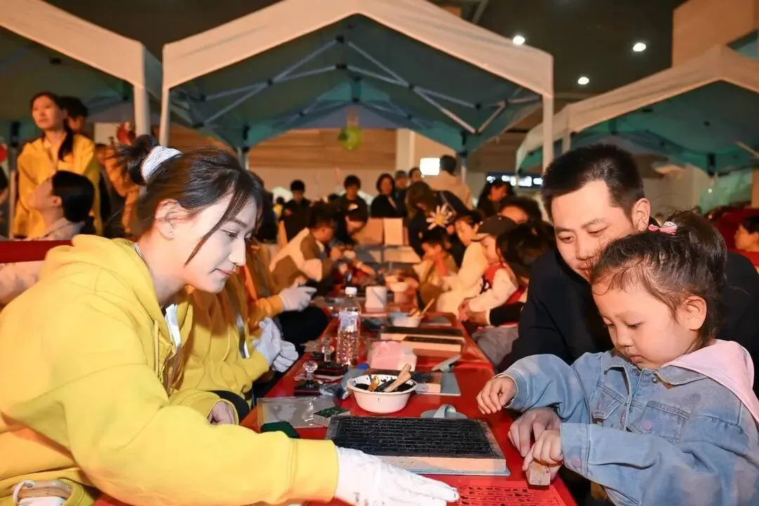 夜市上,游客可以品养生茶、做中药香包、学习中医知识。图为儿童在体验古医书拓印。