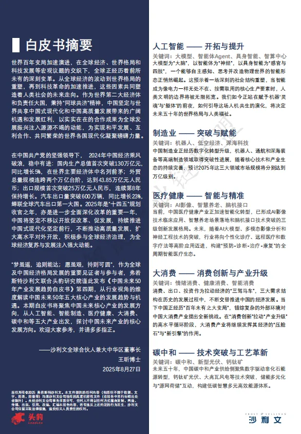 这份白皮书描绘的不仅是产业趋势,更是一幅中国式现代化的产业蓝图。从AI的通用智能到制造的数智转型,从医疗的健康革命到能源的绿色蝶变,中国正以其超大规模市场、完整产业链、持续创新投入和制度优势,为全球可持续发展贡献"同球共济"的东方智慧。未来50年,这些产业将共同构筑起中国高质量发展的坚实底座,也将为世界经济增长注入源源不断的"中国动能"。