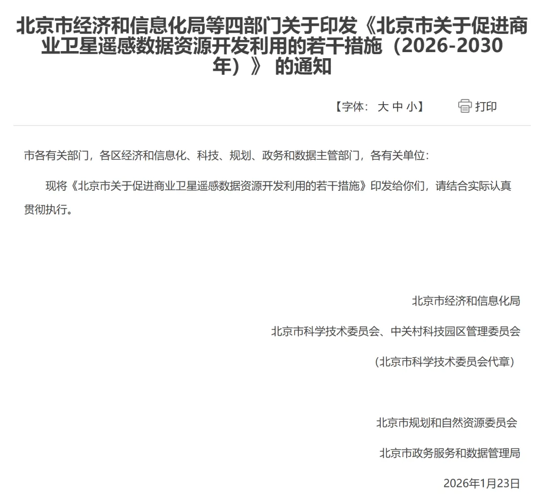 1月23日,北京市经济和信息化局等部门联合印发《北京市关于促进商业卫星遥感数据资源开发利用的若干措施(2026-2030年)》,推进商业卫星遥感数据资源(简称“遥感数据资源”)开发利用,打造天地一体、应用牵引、数智融合的卫星应用服务创新高地,催生一批遥感数据新产品、新服务、新业态。