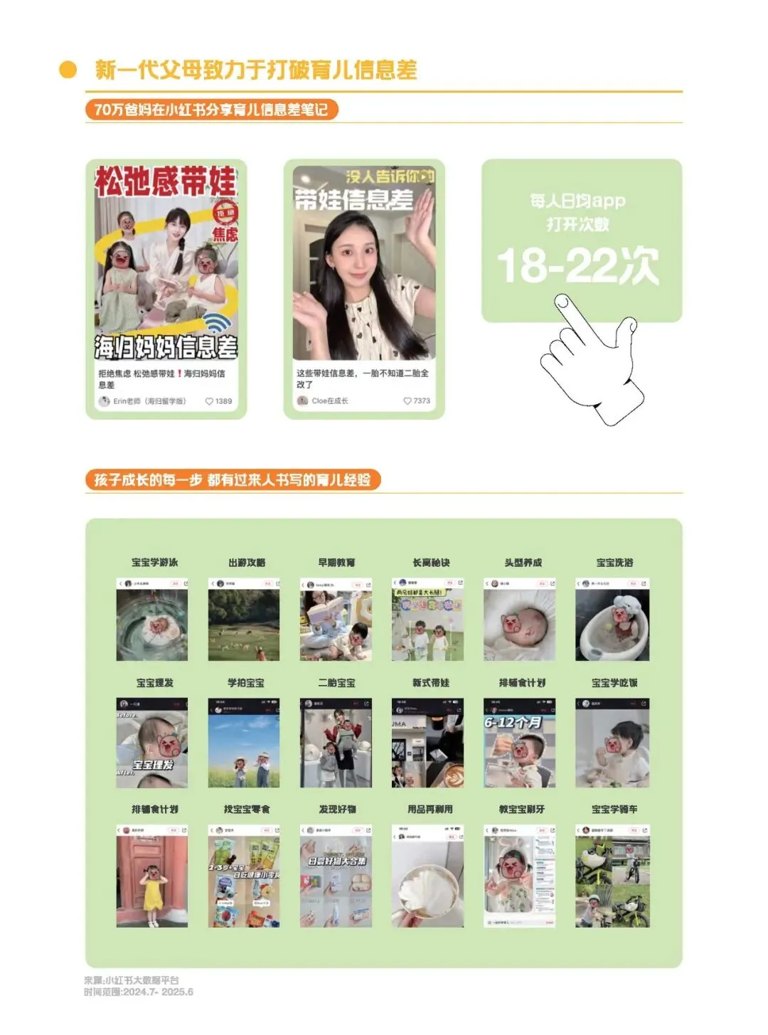 新一代父母在育儿之路上,他们不再满足于传统的育儿经验,而是积极利用各种平台,分享和获取育儿知识。数据显示,有70万爸妈在小红书上分享育儿信息差笔记,内容涵盖宝宝洗浴、学游泳、出游攻略、早期教育等方方面面。这些父母深知,育儿不仅是照顾孩子的日常生活,更是为孩子未来打下坚实基础的关键时期。他们拒绝焦虑,追求松弛感带娃。