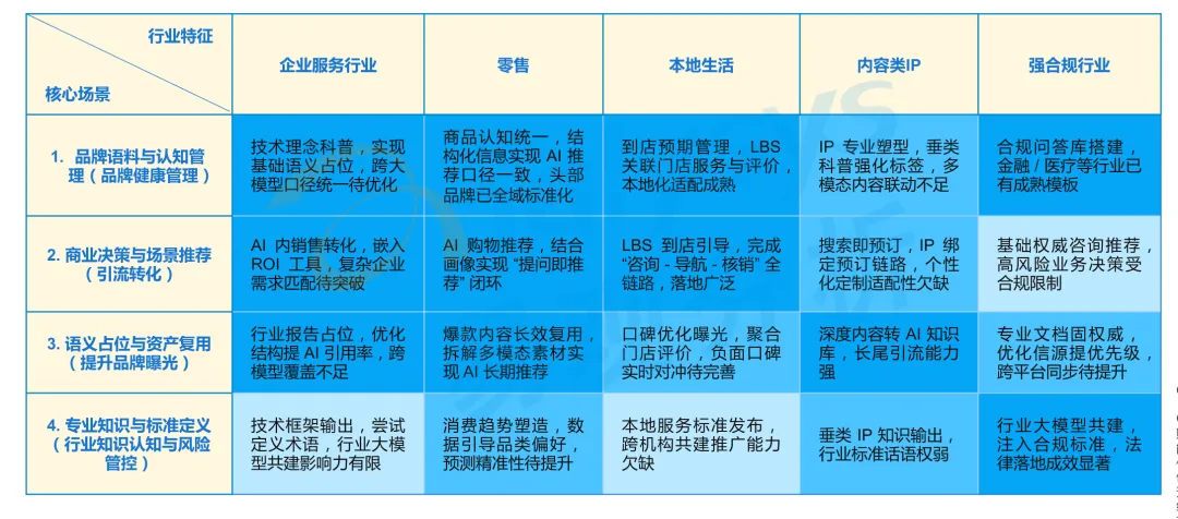 GEO 的应用场景广泛,通用场景包括品牌语料生成管理、商业决策与场景推荐、AI 语义空间品牌占位、专业知识与行业教育四大类。在企业服务、零售、本地生活、文旅、教育、法律等行业,GEO 均已落地适配性应用,通过精准对接行业需求,实现品牌传播、获客引流与风险防范等目标。例如电商行业以 LBS 定位为核心,打造 “种草 - 转化” 短链路;文旅行业通过地域语义绑定破解流量分散难题。
