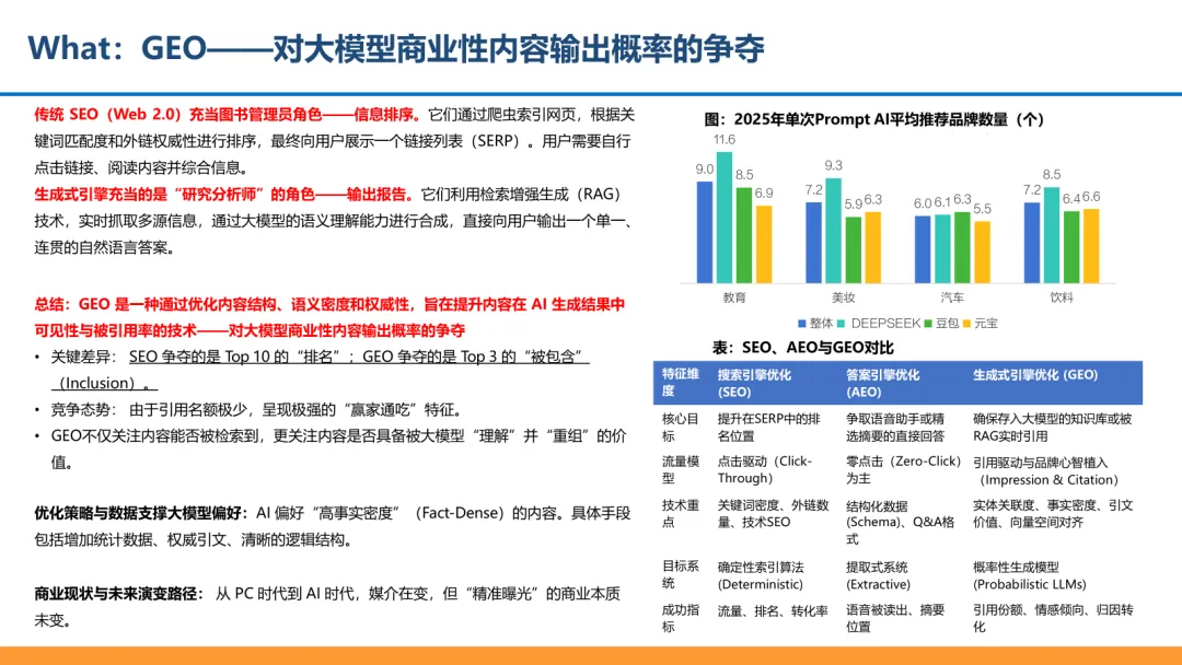 现状与挑战:目前 GEO 最大的短板是难以精准归因。它无法像 SEO 那样通过超链直接追踪购买转化,数据存在断层,所以主要占用品牌的 “品牌预算”,而不是更看重 ROI 的 “效果预算”,价值暂时受限。