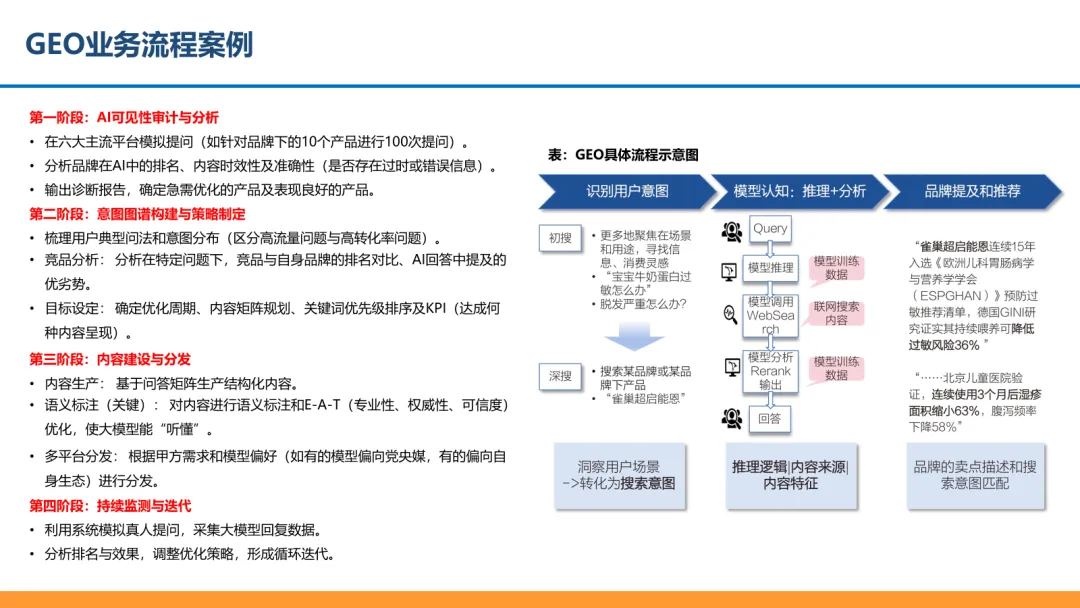 GEO 业务流程案例:四个阶段的业务流程:整个 GEO 项目是一个从诊断、规划、执行到优化的闭环过程。
