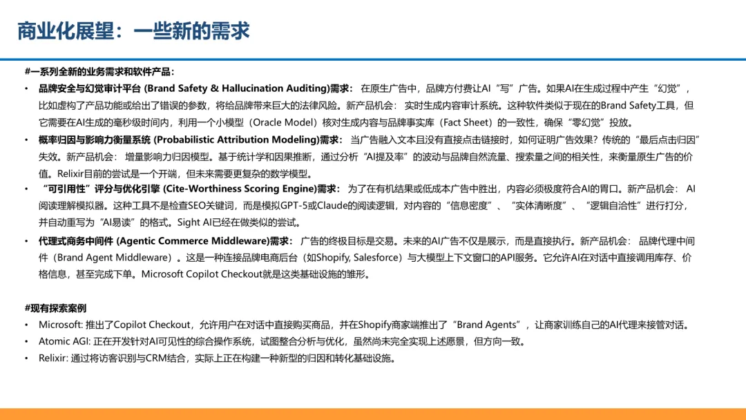 产品机会:需要基于统计学和因果推断的增量影响力归因模型。它通过分析 “AI 提及率” 的波动,和品牌自然流量、搜索量之间的相关性,来衡量原生广告的真实价值。Relixir 目前的尝试是一个开端,但未来需要更复杂的数学模型。