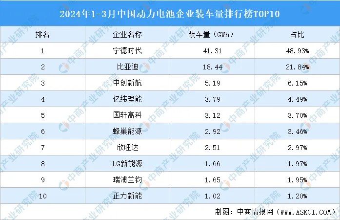 2024年1-3月,我国动力电池累计装车量85.2GWh,累计同比增长29.4%。TOP10企业装车量占比96.66%,TOP5企业装车量占比85.11%,TOP3企业装车量占比76.92%。宁德时代装车量最高达41.31GWh,占比48.93%。比亚迪、中创新航排名第二和第三,装车量分别为18.44GWh、5.19GWh,占比分别为21.84%、6.15%。亿纬锂能、国轩高科、蜂巢能源、欣旺达、LG新能源、瑞浦兰钧、正力新能进入前十,依次排名第4-10名。