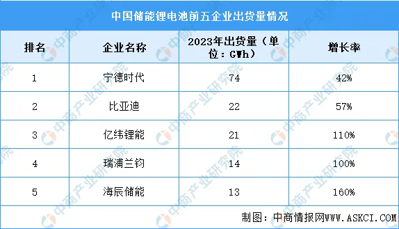 2023年储能锂电池市场中,宁德时代保持在排名第一的位置,出货量约为74GWh。其次分别为比亚迪、亿纬锂能、瑞浦兰钧、海辰储能,具体如图所示: