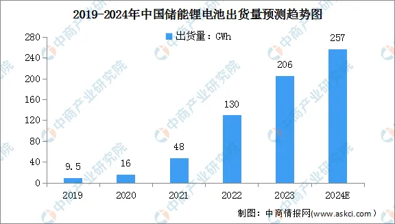 近年来,在风电、光伏装机量持续增长与5G基站建设加快的背景下,储能锂电池需求快速增长。中商产业研究院发布的《2024-2029年全球与中国储能锂电池市场现状及未来发展趋势》显示,2023年我国储能锂电池出货量达206GWh,同比增长59%。中商产业研究院分析师预测,2024年我国储能电池出货量有望达257GWh。