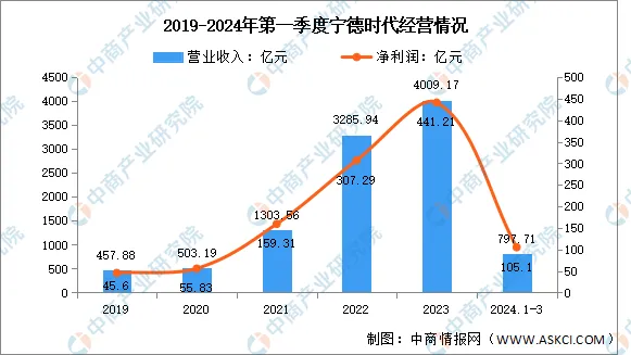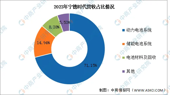 2024年第一季度实现营业收入797.71亿元,同比下降10.41%;实现归母净利润105.1亿元,同比增长7%。2023年主营产品包括动力电池系统、储能电池系统、电池材料及回收,分别占整体营收的71.15%、14.94%、8.38%。