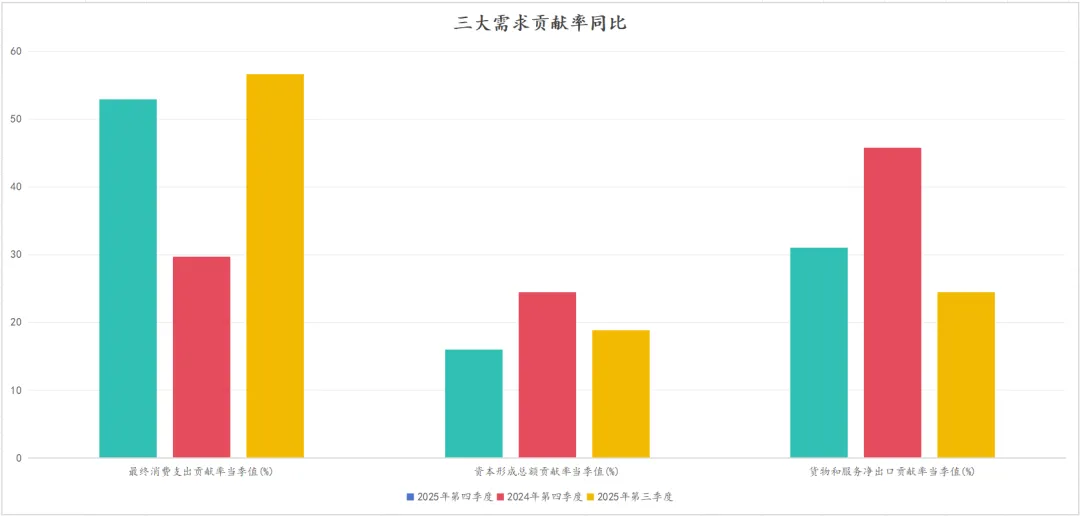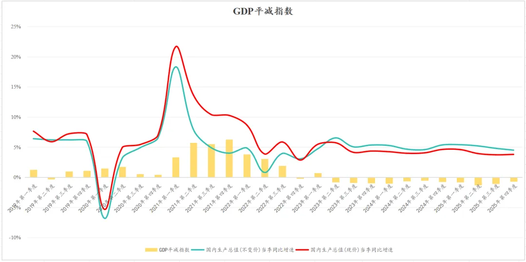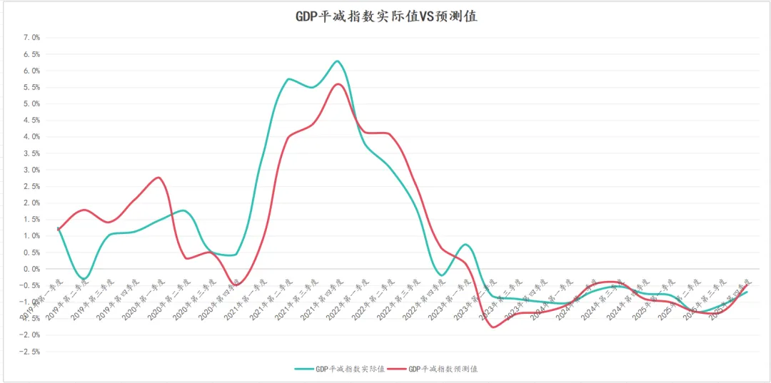 2025年,我国GDP首次突破140万亿元,初步核算数为140.2万亿元、名义增长4%,以不变价计实际增长5%;分季度实际GDP同比增速分别为5.4%、5.2%、4.8%、4.5%,分季度GDP平减指数分别为-0.8%、-1.3%、-1.1%、-0.7%。无论是年度增长还是季度增长,都符合机构的预期,平减指数收窄也和此前的预测相差不大,总体价格水平仍然较低迷。