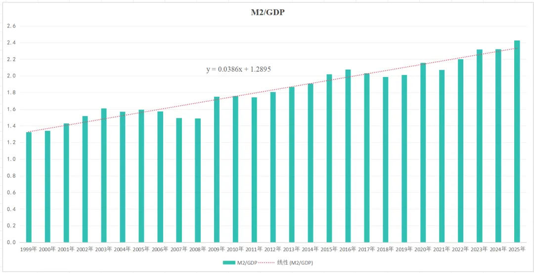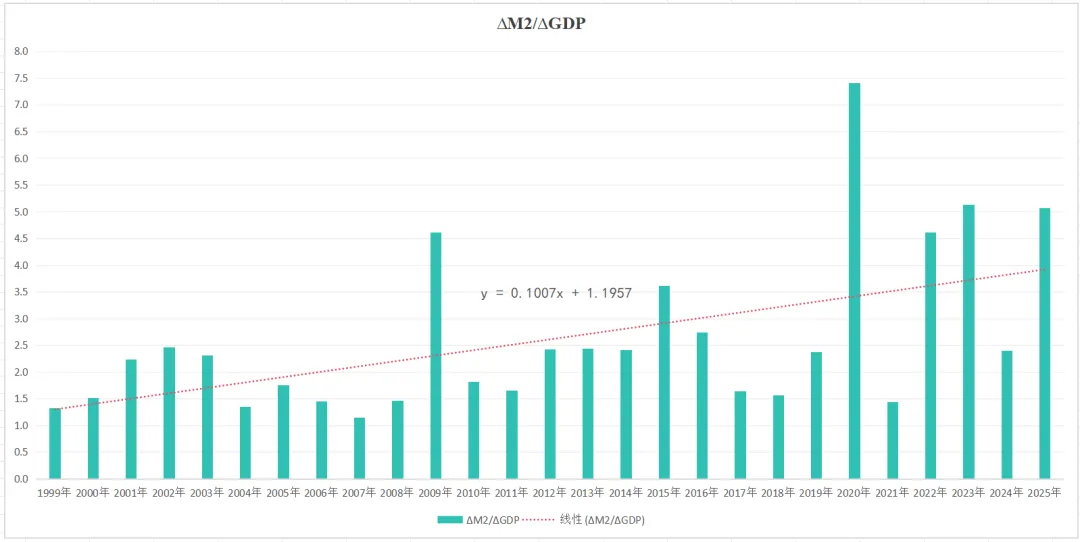 2025年,M2/GDP升至2.43,体现边际货币效率的剧烈波动和下降趋势,ΔM2/ΔGDP波动越来越大,反映货币政策传导效率下降以及经济增长对债务刺激依赖增强。