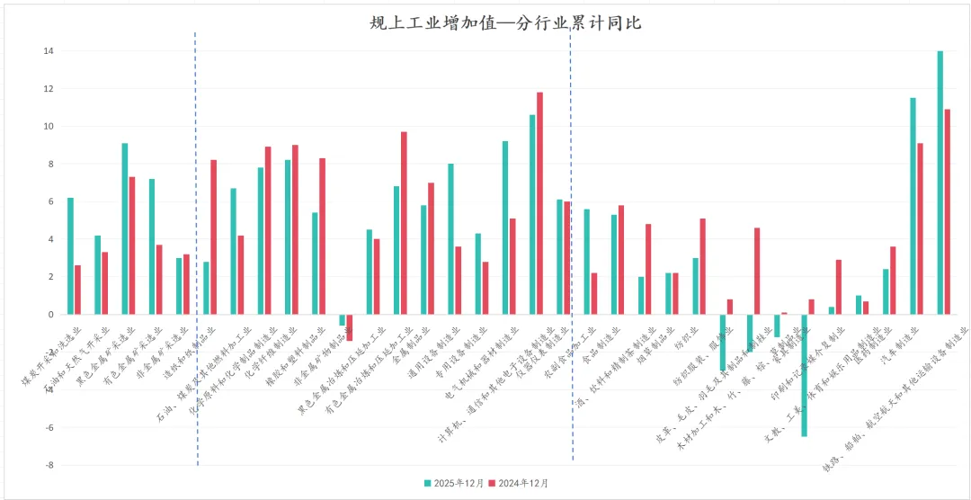 汽车制造业、铁路/船舶/航空航天、电气机械等行业勉强能消化上游高成本。它们要么靠出口,12月汽车、集成电路、手机出口增速加速上行,分别为71.6%(前值53%)、47.7%(前值34.2%)和10.6%(前值-12.6%);要么靠国家投入和产业升级,例如铁路/船舶/航空航天、通用设备、汽车制造业等,2025年3D打印设备、工业机器人、新能源汽车产品产量分别增长52.5%、28%、25.1%。