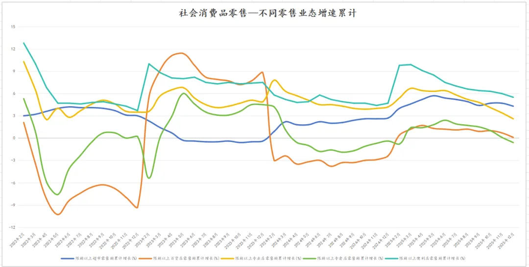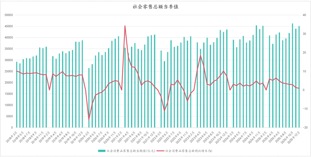 2025年,社会消费品零售总额同比增长3.7%,其中除汽车以外的消费品零售额增长4.4%;12月社会消费品零售总额同比增长0.9%,其中除汽车以外的消费品零售额增长1.7%,商品零售同比增长0.7%、餐饮收入同比增长2.2%,均明显走弱;全年服务零售额同比增长5.5%,对社零形成一定支撑。