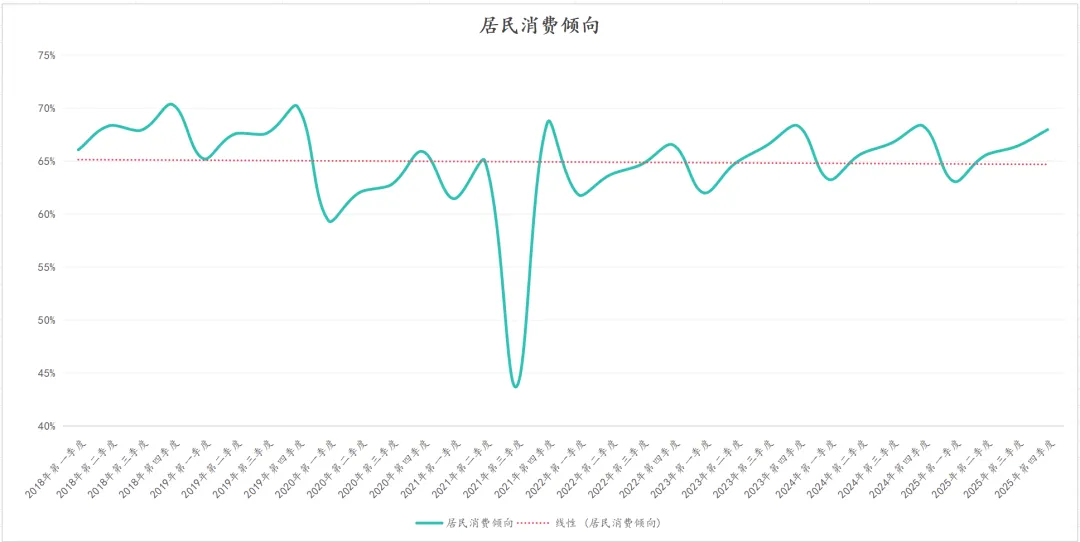 2025年四季度,人均居民收入和支出累计增速分别为5%、4.4%,较去年同期分别下降0.3、0.9个百分点,支出增速显著落后于收入增长,居民消费倾向未能延续修复趋势,由2024年68.3%下降至68%,这表明名义收入的增长向消费支出的转化受到制约,消费内生动能尚不牢固。