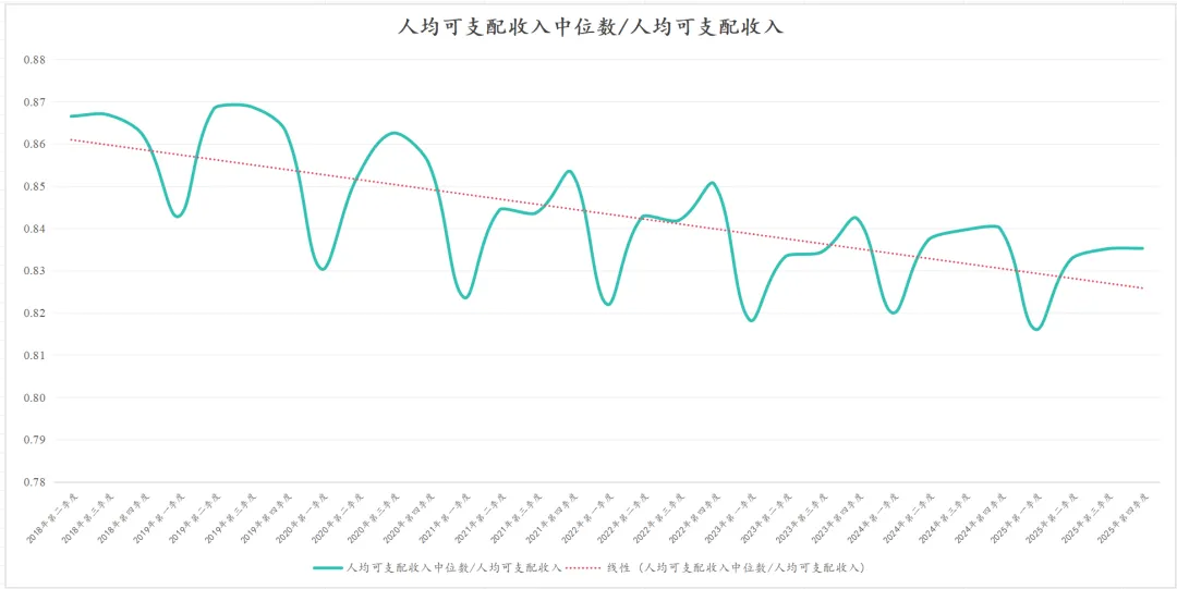 接着是消费的透支效应显现,以旧换新政策在下半年边际效应减弱,汽车、家电等大额消费明显回落,社零增长持续下行,显示内生增长动力不足;人均收入中位数/平均数比例(0.84)总体仍处于持续下行通道,中低收入群体(中位数)无力消费,居民消费倾向由68.3%降至68%,防御性储蓄心理显著;青年失业率(17.3%)创同期历史新高,就业市场压力仍较大。