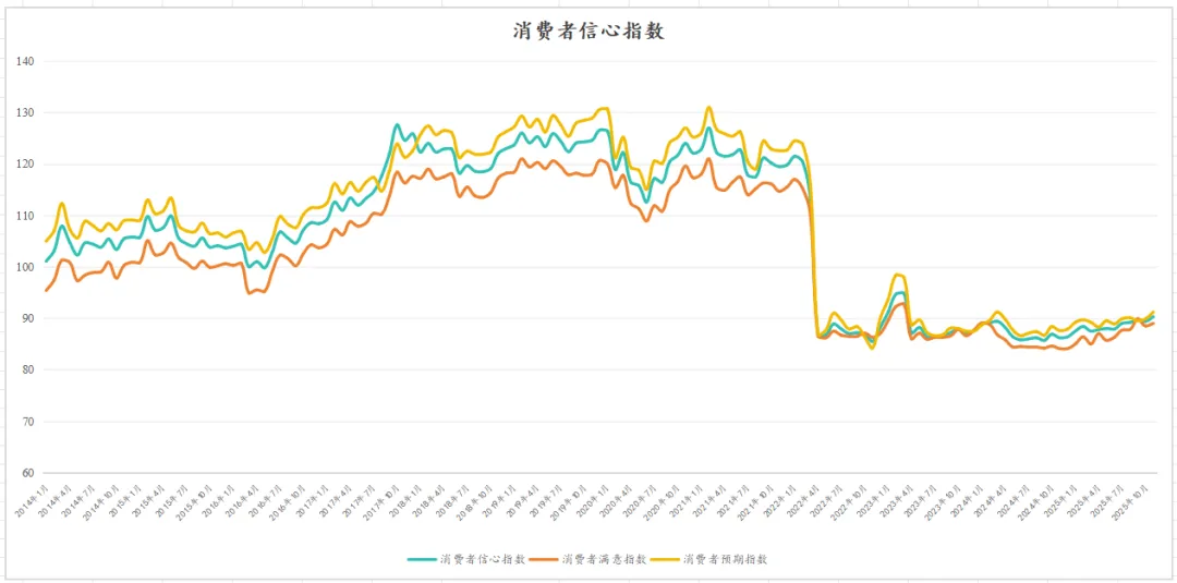 不过,消费者信心指数略有回升,2025年11月消费者信心指数、消费者满意指数、消费者预期指数分别为90.3、89、91.2,较7月均提高1.3个百分点。