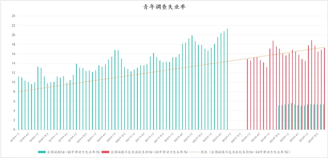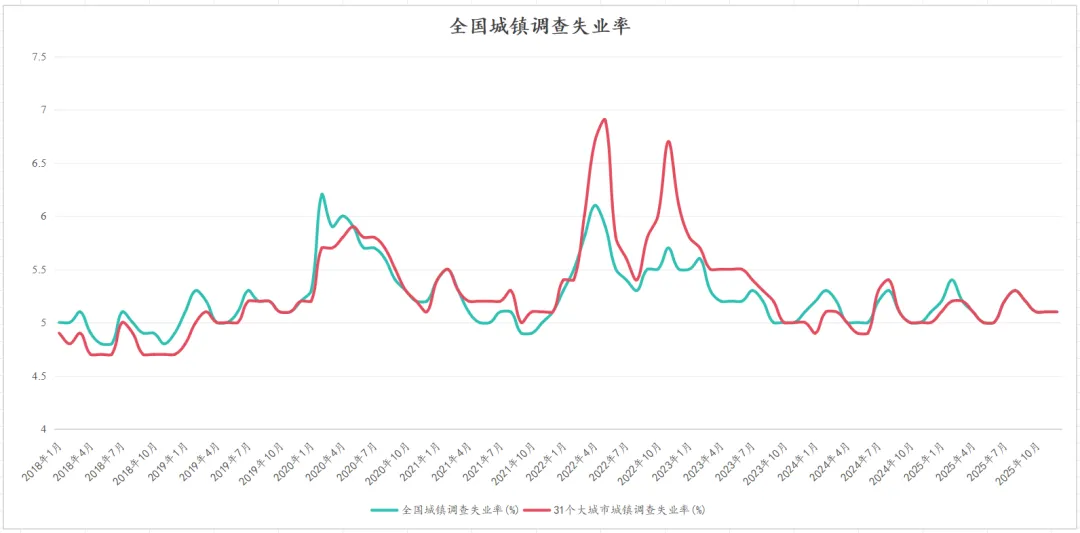2025年,全国城镇调查失业率平均值为5.2%,其中12月为5.1%、连续三个月不变;12月,全国城镇不包含在校生的16—24岁劳动力失业率为17.3%、同比提高1.6个百分点,有记录以来的历史新高。