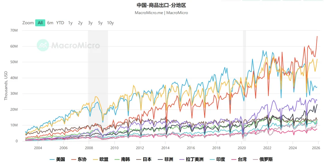 全年来看,2025年我国对美国出口金额同比下降20%,美国在我国出口总额中占比较去年年末下降3.5个百分点至11.1%;对东盟出口金额同比增长13.4%,占比较去年年末上升1.2个百分点至17.6%;对欧盟、香港、印度、拉美、非洲的出口金额分别同比增长8.4%、15.5%、12.8%、7.4%和25.8%,非美贸易稳固发展,有效对冲了对美贸易下滑对我国出口的冲击。