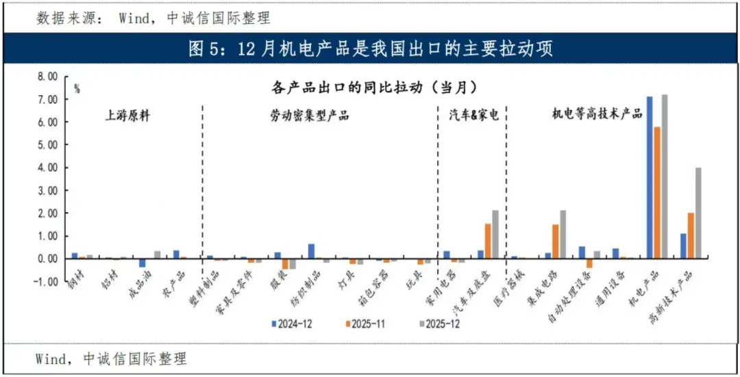 全年来看,2025年我国出口产品“强机电、弱劳密”特征显著,箱包、玩具等七大类劳动密集型产品合计拖累全年出口增速0.78个百分点,而机电产品拉动全年出口增速4.95个百分点,出口产品结构不断优化。