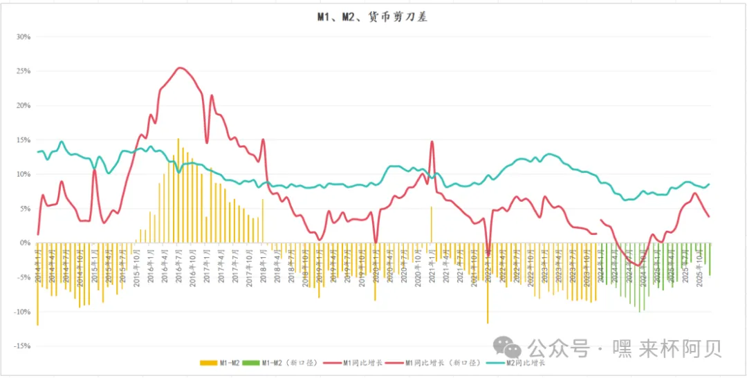 首先实际与名义的背离,实际GDP增长5%、名义增长仅4%,连续的长周期GDP平减指数为负,企业和个人感受到的冷感源于名义收入增速的放缓;最终消费贡献率上升并非源于消费爆发,而是由于资本形成贡献率大幅下降导致的被动提升;M2/GDP升至2.43,货币投放的边际拉动力持续衰减,资金在金融体系内对冲债务等,未能转化为有效的信用扩张,居民信贷低迷,M1增速回落、剪刀差维持扩大。