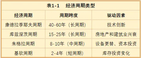 经济发展过程中的繁荣与萧条存在着周期性规律,不同理论构建的经济周期有长有短,驱动因素也不尽相同。康德拉季耶夫周期、基钦周期、朱格拉周期、库兹涅茨周期是最具代表性的经济周期(见表1-1)。