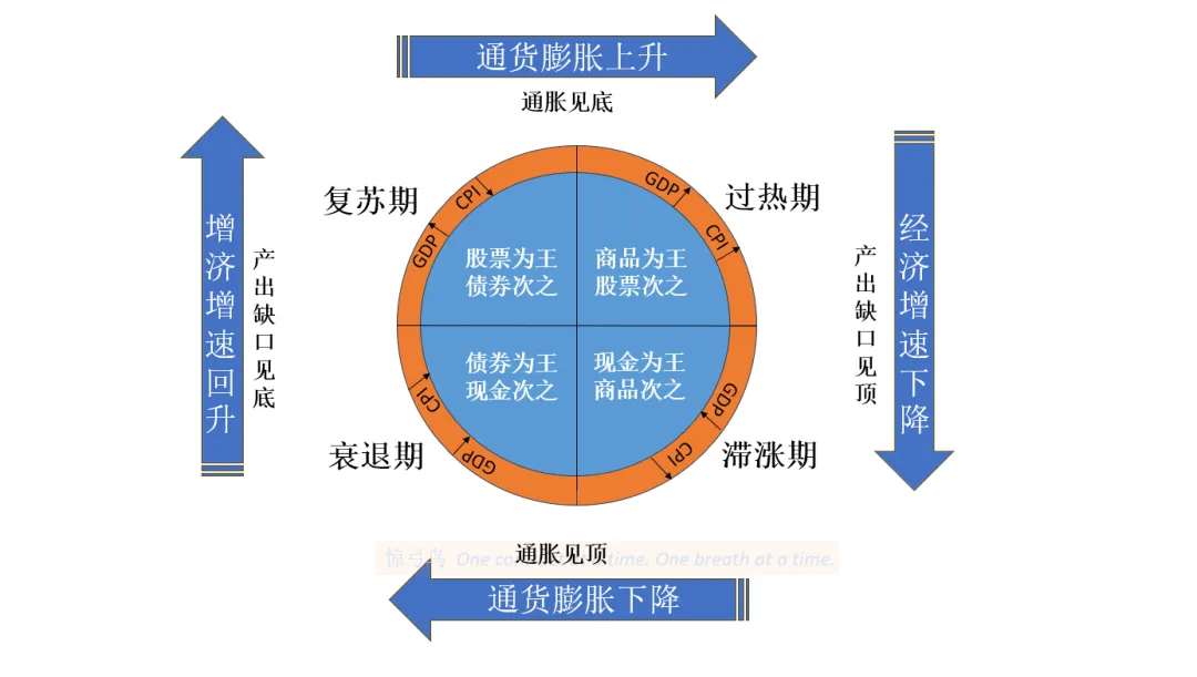 美林投资时钟理论将每个经济周期划分为四个阶段:复苏期、过热期、滞涨期、和衰退期,认为在不同阶段应该配置不同的资产(见图1-1)。
