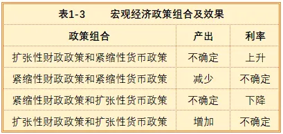 根据经济状况和不同目标,政府和中央银行可选择不同的政策组合,政策效果也不同(见表1-3)。例如,当经济萧条但不严重时,可采用扩张性财政政策刺激总需求,同时采用紧缩性货币政策控制通货膨胀;当经济发生严重通胀时,可采用紧缩性货币政策提高利率,降低总需求水平,同时又采用紧缩性财政政策防止利率过分提高;当经济出现通货膨胀但不严重时,可采用紧缩性财政政策控制总需求,同时又采用扩张性货币政策降低利率,防止财政紧缩导致衰退;经济严重萧条时,可采用扩张性财政政策增加总需求,同时采用扩张性货币政策降低利率,削减政府支出增加对私人消费或投资的“挤出效应”。