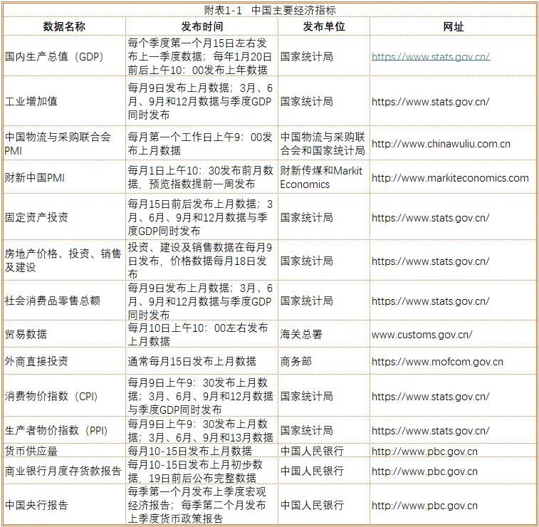 中国的GDP数据由国家统计局发布,季度GDP初步核算数据在季后15天左右公布,初步核实数据在季后45天左右公布,最终核实数据在年度GDP最终核实数发布后45天内完成。年度GDP初步核算数在年后20天公布,而独立于季度核算的年度GDP核算初步核实数据在年后9个月公布,最终核实数据在年后17个月公布。中国主要经济指标见本章附表1-1。