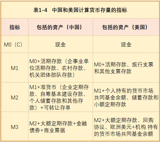 除此之外,各国还会根据自身情况作出一些具体规定。例如,在M2基础上再加上大额定期存款和一些流动性较低的金融资产。这种范围更宽的货币通常记为M3(见表1-4)。