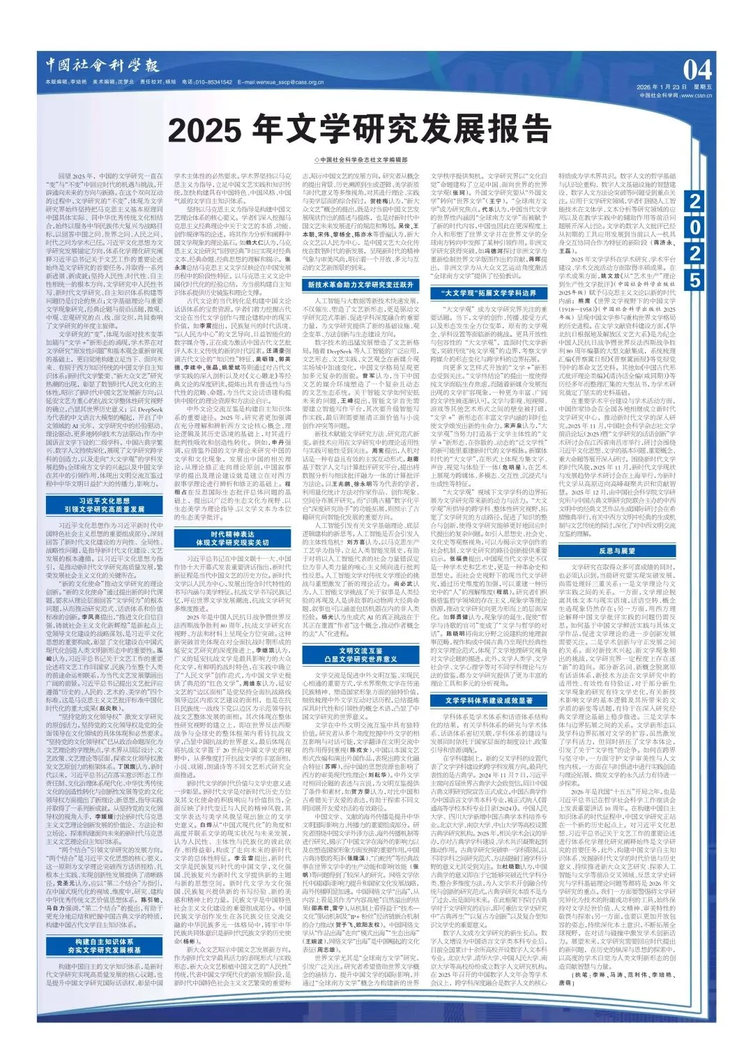 2026年是我国“十五五”开局之年,也是习近平总书记在哲学社会科学工作座谈会上发表重要讲话10周年。在构建中国自主知识体系的时代征程中,中国文学研究正站在一个新的历史起点上。对习近平文化思想、习近平总书记关于文艺工作的重要论述进行体系化学理化研究阐释始终是文学研究的首要任务,此外,构建中国文学自主知识体系、发掘新时代文学的时代价值与历史意义、持续推进新大众文艺研究、探索人工智能与文学等前沿交叉领域、反思文学史研究与学科基础理论问题等都将是2026年文学研究的重点。我们一方面要警惕将文学研究异化为技术的附庸或功利的工具,始终保持对文学经世价值、人文精神、审美特性的敬畏与探索;另一方面,也要以更加开放包容的姿态,持续深化本土意识,不断拓展全球视野,在对话与碰撞中激发学术创新活力。展望未来,文学研究需要回应时代提出的新问题,在历史的纵深与思想的探索中,以高度的学术自觉为人类文明新形态的创造贡献智慧与力量。
