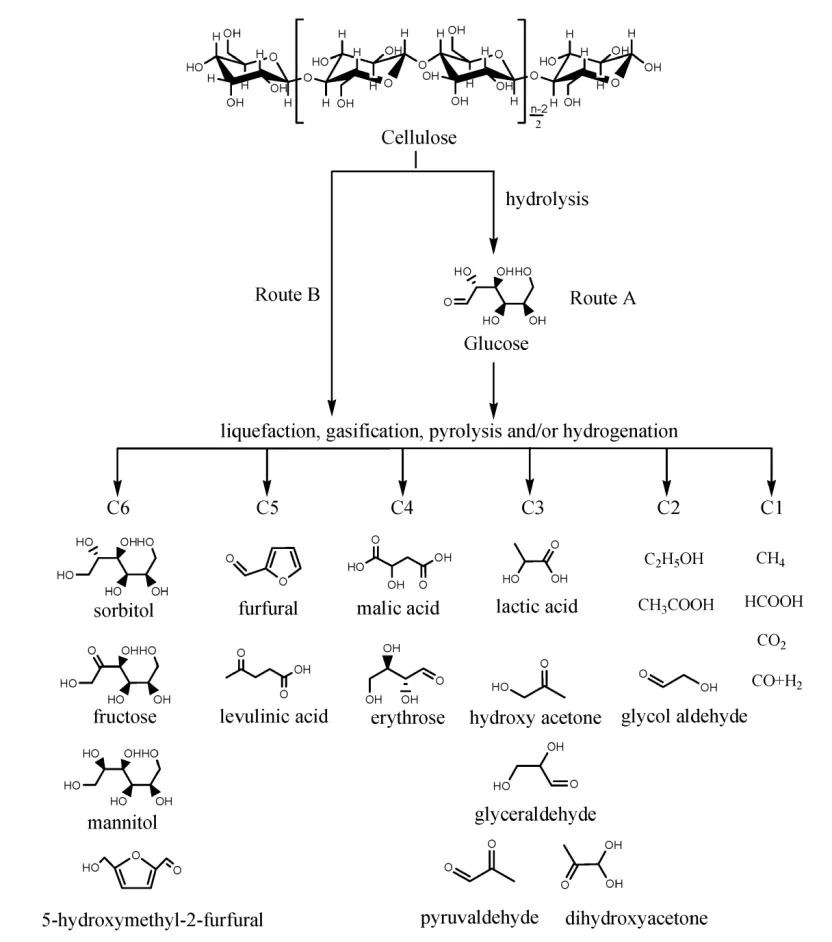 目前研究重点集中在含量最高的纤维素上,旨在将其转化为高值化学品。现有主要路径包括: