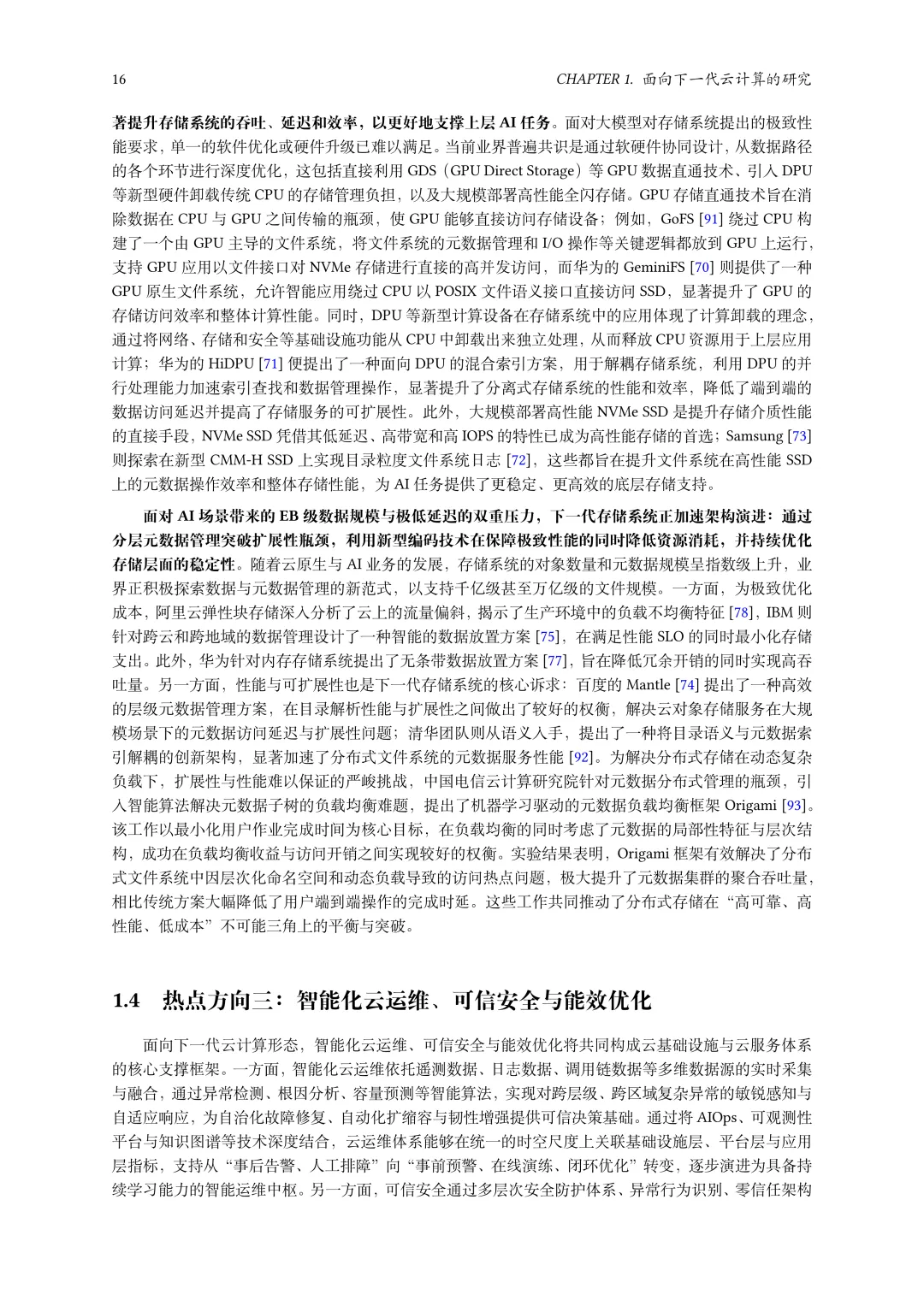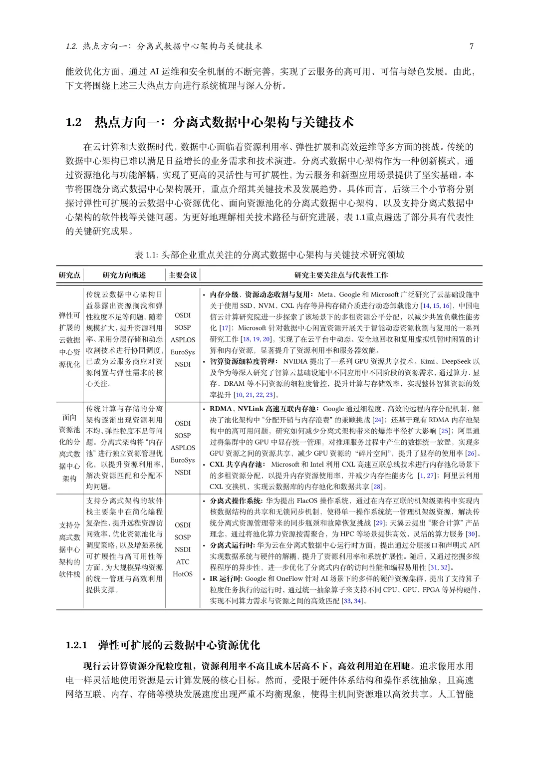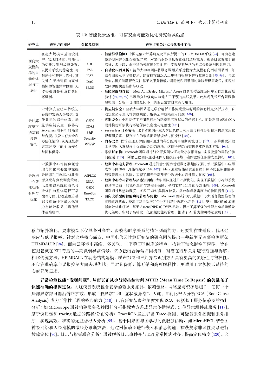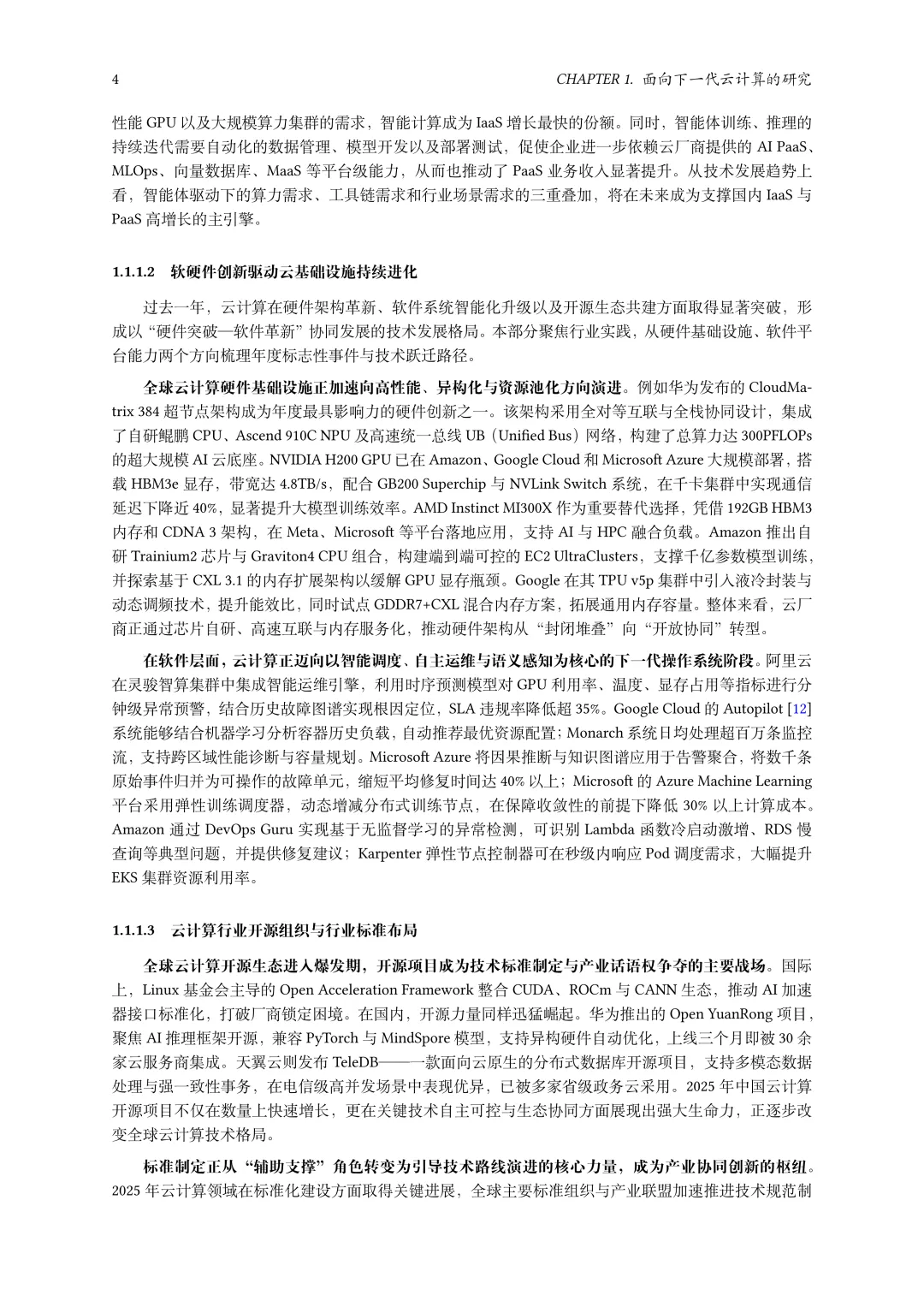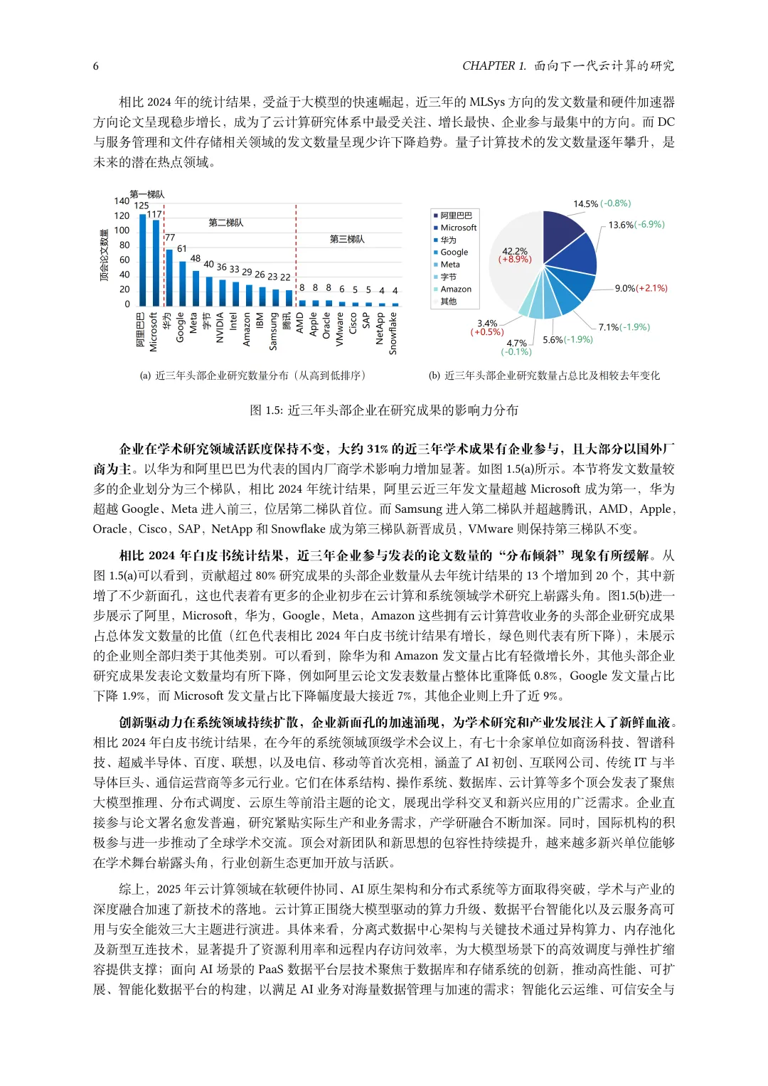 第一章,面向下一代云计算的研究,首先分析了 2024 年国际国内的市场数据,解读了 IaaS、PaaS、SaaS 的占比及变化趋势,然后讨论了云计算开源和标准方面的进展,之后对行业软硬件技术热点做追踪,并利用近三年高水平论文统计梳理了技术热点,涉及 14 个 CCF 收录的顶级学术会议的 2800 余篇论文。统计结果显示,企业参与论文依然占据 1/3,新的变化是更多企业新面孔开始出现,例如中国电信等传统运营商、智谱等创业期企业。下一代云计算讨论了三个热点方向,分别是:(1)分离式数据中心架构和关键技术(2)面向 AI 场景的 PaaS 数据平台层技术(3)智能化云运维、可信安全与能效优化。